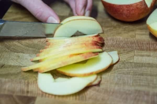 1. 2 rote Äpfel mit Schale halbieren, entkernen und in feine Spalten schneiden. Sie erinnern in der Form an Halbmonde. Einen kleinen Topf mit Wasser und einem Spritzer Zitronensaft auf den Herd stellen, die Apfelscheiben hineingeben und ca. 2 Minuten köcheln lassen, aus dem Wasser nehmen und kurz abkühlen lassen. Die Apfelscheiben dürfen nicht zerfallen, sollen aber schön biegsam werden.