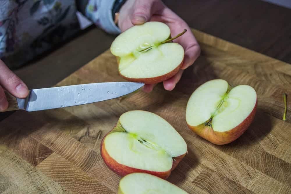 1. 2 rote Äpfel mit Schale halbieren, entkernen und in feine Spalten schneiden. Sie erinnern in der Form an Halbmonde. Einen kleinen Topf mit Wasser und einem Spritzer Zitronensaft auf den Herd stellen, die Apfelscheiben hineingeben und ca. 2 Minuten köcheln lassen, aus dem Wasser nehmen und kurz abkühlen lassen. Die Apfelscheiben dürfen nicht zerfallen, sollen aber schön biegsam werden.
