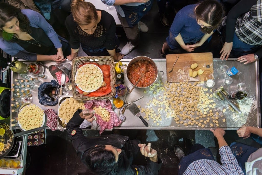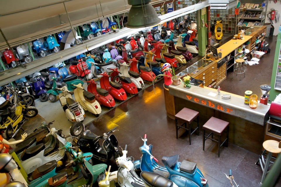 Kochen zwischen Vespas und Werkzeugen! Die Vesbar ist ohne Zweifel ein sehr spezieller Veranstaltungsort für Food-Events. Viele sind vermutlich erst einmal skeptisch, wenn sie die Vespa-Werkstatt betreten und fragen sich, wo und wie hier ein Kochkurs satt finden soll. Aber schon nach wenigen Minuten an der industrie-schicken Bar oder in der netten kleinen Show-Küche mit dem Entertainer und Gastgeber Raffaele Trongone werdet ihr blitzschnell warm mit der extraordinären Location. Spätestens wenn die ersten verführerischen Düfte von Salbei, gedünstetem Gemüse und Basilikum aufsteigen, fühlt ihr euch wie in Neapel. Und eine herrlich angenehme Lockerheit und eine große Lust zu essen, kochen, trinken und reden macht sich breit. Genießt in der Vespar spannende und unvergessliche Stunden.