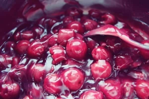 - Die Kirschen für die Füllung zu dem Kirschsaft-Pudding hinzufügen und umrühren.