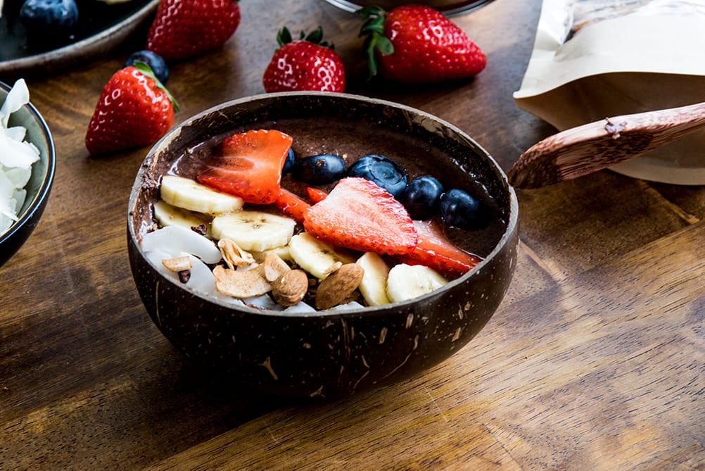 Unser Frühstück ist jetzt knallbunt, fruchtig und zum Auslöffeln – Smoothie-Bowls machen jetzt neben Porridge und Smoothies morgens eine richtig gute Figur. Was ist denn jetzt schon wieder eine Smoothie-Bowl? Eigentlich nichts anderes als eine Erweiterung von Smoothies. Die werden jetzt durch die Zugabe von viel gefrorenem Obst, ganzen Früchten und nussig-knusprigen Toppings noch vitaminreicher, sättigender, bekommen eine cremigere Konsistenz, bleiben dabei aber wunderbar frisch. Alles, was du brauchst, ist eine fruchtige Basis. Dazu kannst du Obst deiner Wahl Banane, Kiwis, Erdbeeren, Pfirsiche, Mango, Ananas oder ähnliches gefroren oder pur im Mixer schön cremig pürieren. Die Fruchtkomponente kannst du auf gesunde Weise süßen. Zum Beispiel mit Agavendicksaft, Erdnuss-, Mandel– oder Kokosnussmus. Zu einem gesunden Frühstück gehört natürlich auch mindestens ein Superfood: Also toppst du deine Smoothie-Bowl mit Chia-Samen, Hanfproteinpulver, Goji-Beeren, Maulbeeren oder Acai-Pulver. Und wenn du noch mehr Biss brauchst, machen sich Haferflocken, Erdnüsse, Cranberrys oder Datteln. Für knallige Farben sorgen Himbeeren, Spinat, Matcha oder Mango.