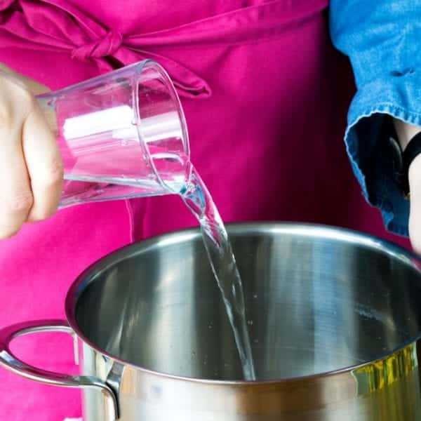 - Die gewaschenen Blüten in einem Topf mit Wasser sprudelnd aufkochen lassen.