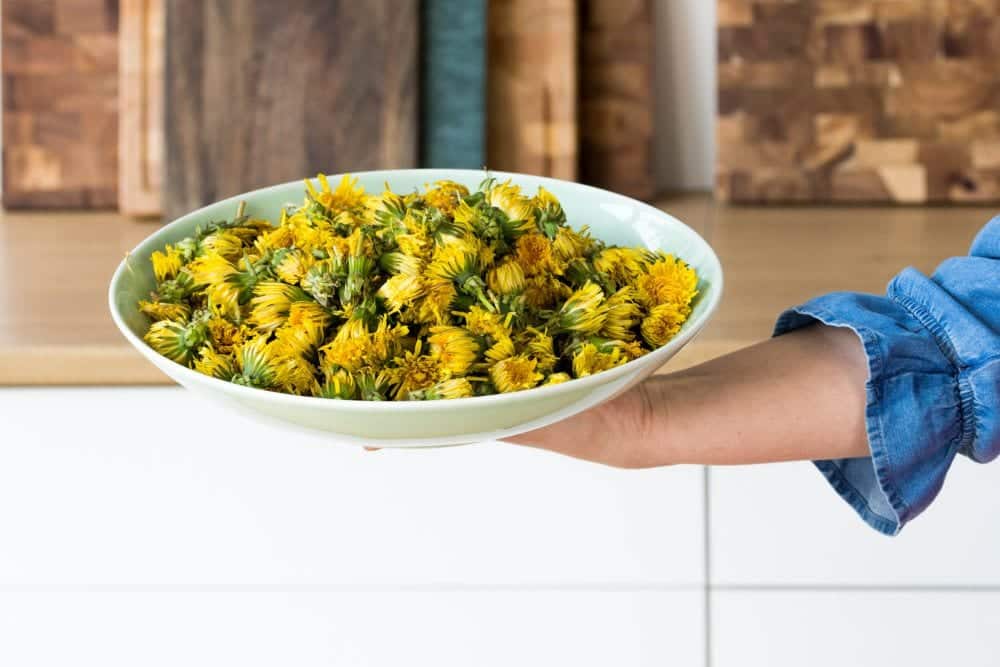 - Löwenzahnblüten kalt waschen und trocknen lassen.