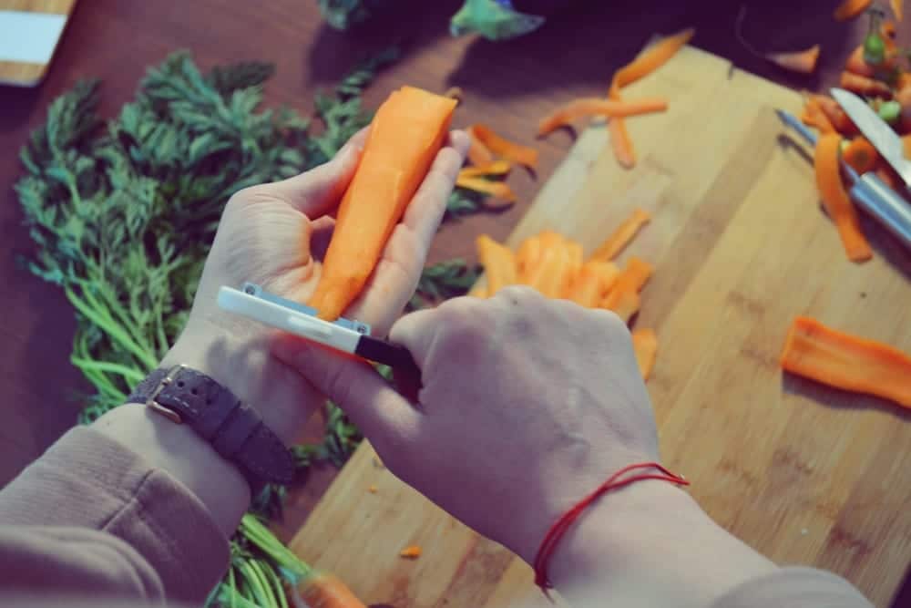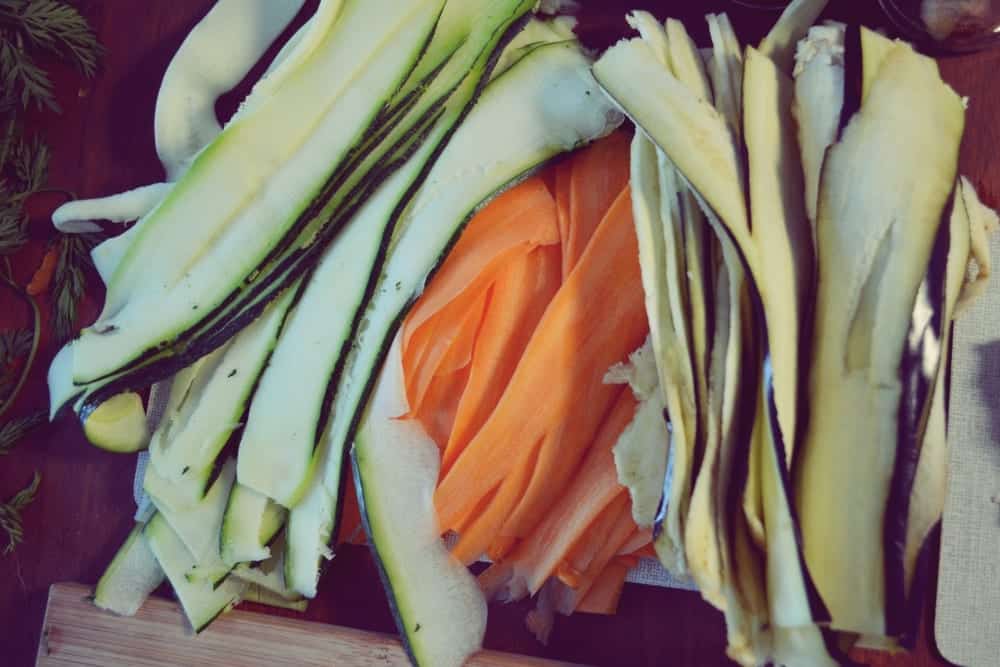 4. Gemüse vorbereiten: Gemüse waschen und mit einem Gemüsehobel in dünne Streifen schneiden. Wichtig: die Streifen dürfen nicht zu dick sein, sondern müssen leicht biegbar sein. Achte darauf, dass die Gemüsestreifen alle eine ähnliche Breite haben. Gemüsestreifen mit Salz und Pfeffer würzen.