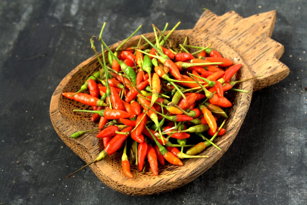 Thai-Chili werden auch Bird`s Eye Chili genannt. es gibt sie in grün (unreif) und leuchtend rot (reif). Wie der Name bereits verrät stammen diese Chili aus Thailand. Rein äußerlich ähneln sie Peperoni, sind aber viel kleiner – etwa 3-4 cm lang und deutlich schärfer. Mit 100.000 bis 225.000 Scoville brennen sie schon sehr intensiv und langanhaltend. Zugleich haben sie einen angenehm fruchtigen Geschmack. Im Asialaden werden sie meist in kleinen Sträußen mit mindestens 30 Schoten verkauft. Anders, als z.B. Jalapenos sind Thaichili recht dünnfleischig und lassen sich daher sehr gut trocknen und aufbewahren. Sie werden gerne in der asiatischen Küche verwendet: frisch geschnitten und direkt mitgebraten – oder in Chutneys, der rote Thai-Curry-Paste und anderen Chili-Saucen.