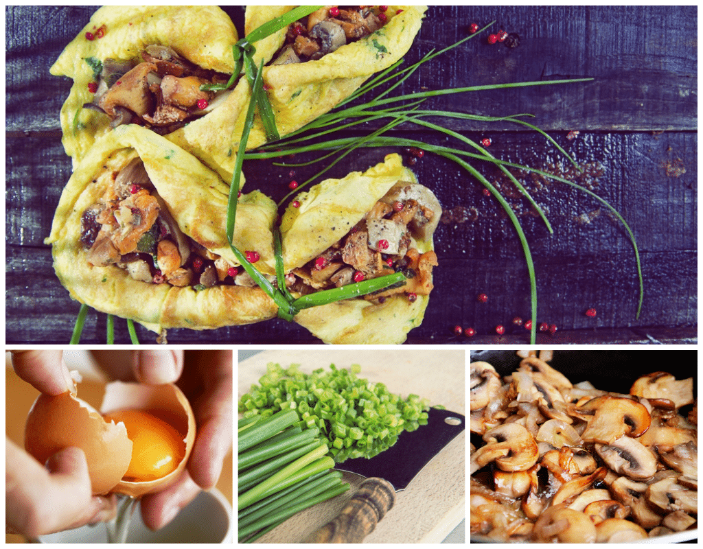- Pilzfüllung auf die Omletts geben und diese darüber klappen, zu hübschen Muscheln formen und mit blanchierten Schnittlauchhalmen zubinden.