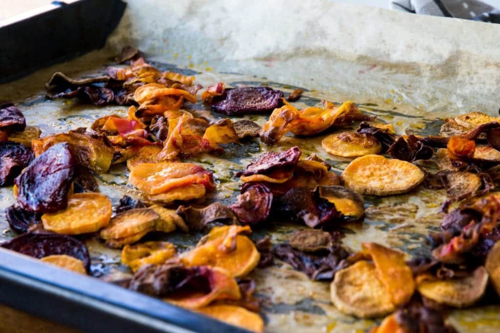 Kartoffelchips sind euch zu langweilig? Wir haben eine bunte Alternative! Ein schnelles Rezept für knackige Gemüsechips. Unsere Chips sind außerdem noch schön fettarm. Ihr könnt also mit gutem Gewissen knabbern. Rote Bete, Karotten oder Kohlrabi hobeln, mit ein bisschen Olivenöl, Salz, Pfeffer und Chili würzen und schonend schön knusprig im Ofen zubereiten. Tipp: unbedingt nachmachen und zum nächsten Film servieren.