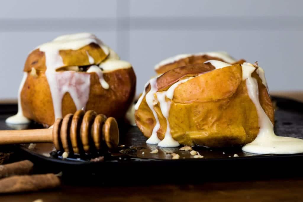 Wieder mal Bratäpfel machen? Ein echtes Aha-Erlebnis für uns! Sie sind unglaublich einfach und so lecker. Die ganze Wohnung duftet nach Apfel, Nüssen und Weihnachten. Diese klassische Wintersüßigkeit sorgt in gut 30 Minuten für ein so heimeliges, geborgenes und stimmungsvolles Gefühl, dass wir gar nicht genug davon bekommen können. Wir haben unsere Äpfel mit Vanillesoße gegessen. Wer etwas Besonderes ausprobieren möchte, serviert sie mit einer cremigen Zabaglione.