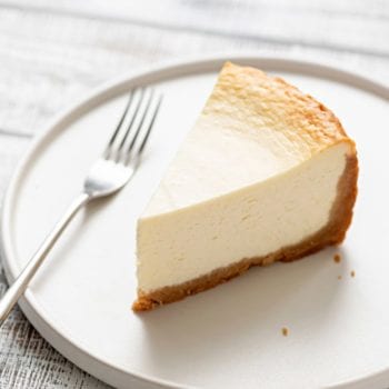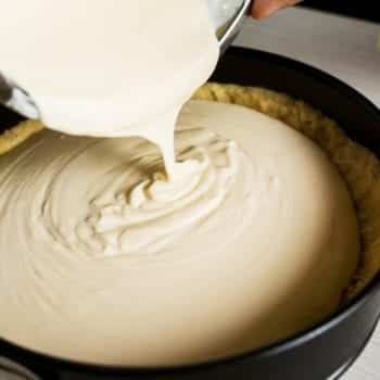 Wenn der Rand des Käsekuchens beim Backen langsam goldbraun wird, ist er fertig. Der Rand sollte ungefähr 1 – 2 cm dick sein und sich leicht von der Kuchenform weg nach oben wölben. Wichtig: die Füllung sollte nicht goldbraun sein, sondern blass bleiben. Wenn die Mitte auch bräunt, ist der Cheesecake schon zu lange im Ofen.