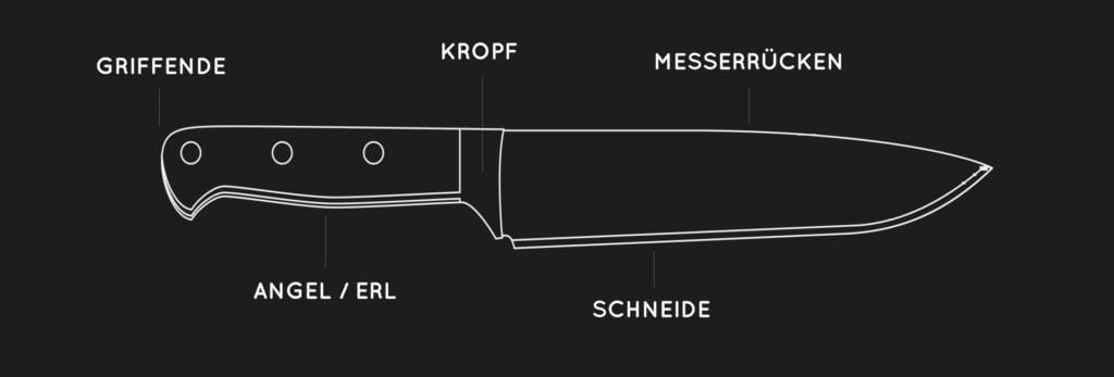 Zunächst einmal ist es hilfreich zu verstehen, aus welchen Teilen ein Messer besteht, um zu verstehen, woran man die Qualität eines guten Messers festmachen kann. Denn wer weiß schon so genau, was sich hinter den Begriffen „Erl“ und „Kropf“ oder „Angel“ versteckt? Im Schaubild zeigen wir die wichtigsten Bestandteile eines Messers.